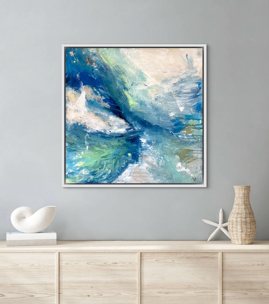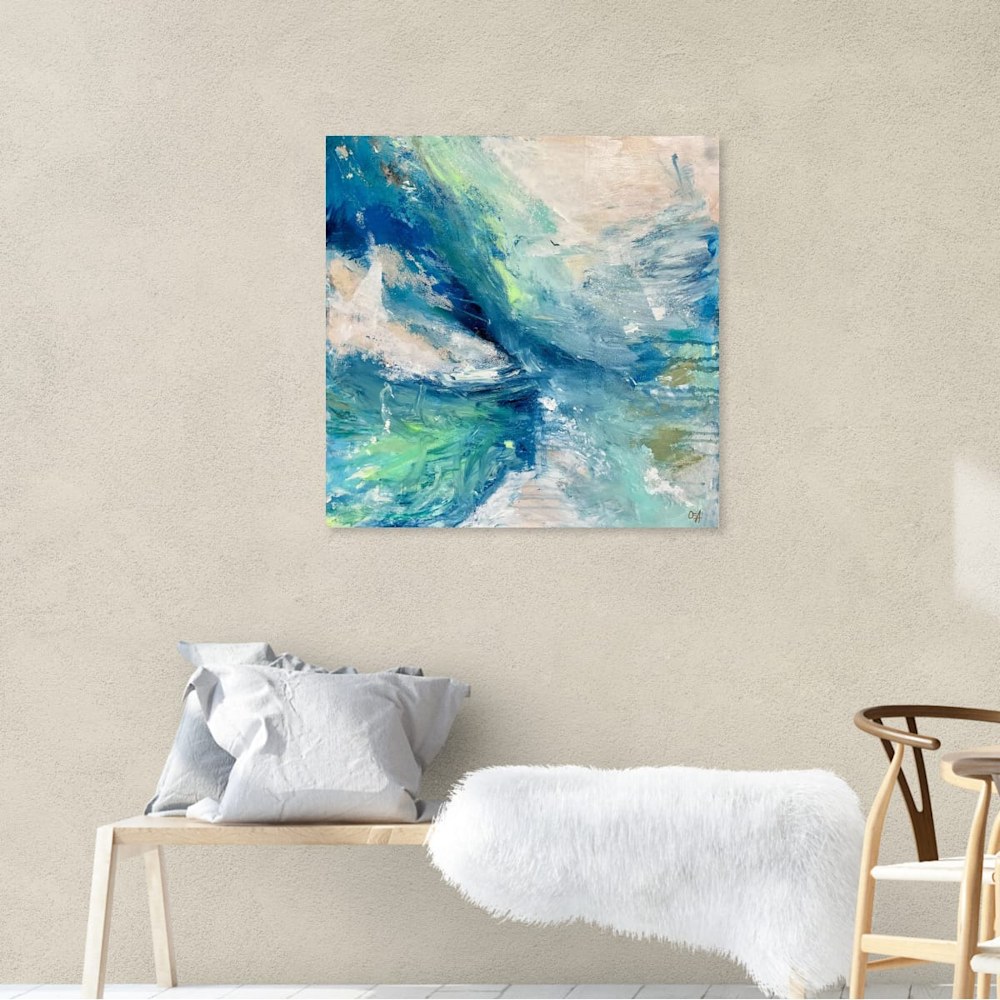 Catch the Wave — I layered blues and sea greens across a textured surface to portray the ocean in motion. Soft whites and sandy beige suggest breakers and light skimming the water, while expressive brushwork builds rhythm and depth. A soothing, thoughtful addition to your space.