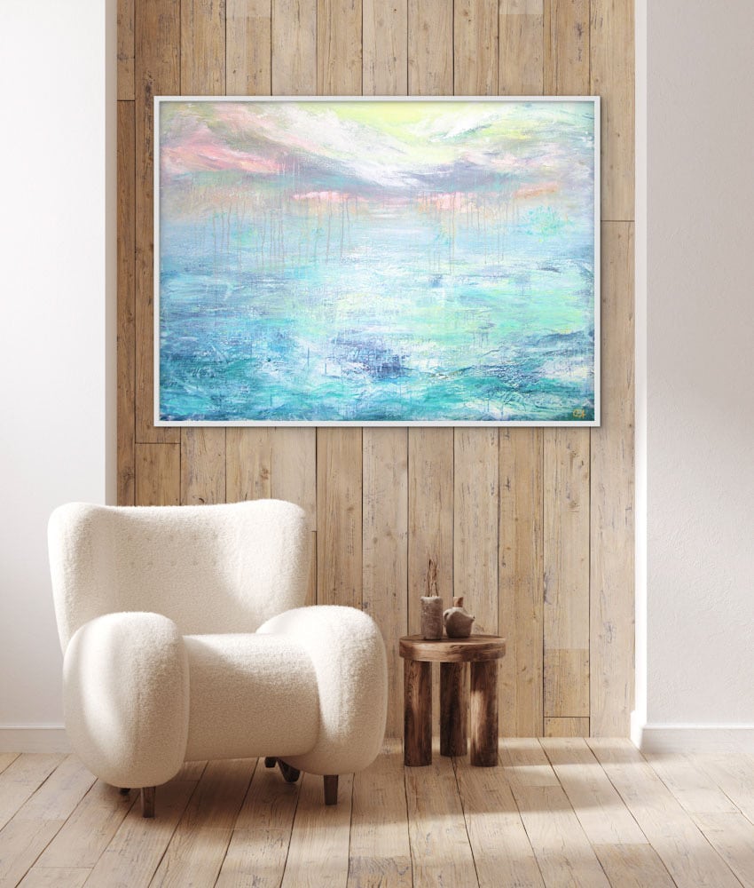 As dawn awakens, the first light gently spills across the sea. Soft hues of pastel pink, blue with hints of teal and golden light whispering a promise of a new day. Painted with my fingertips, no brushes. Original Framed in white float frame.