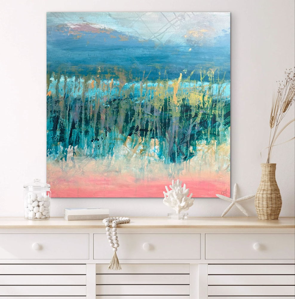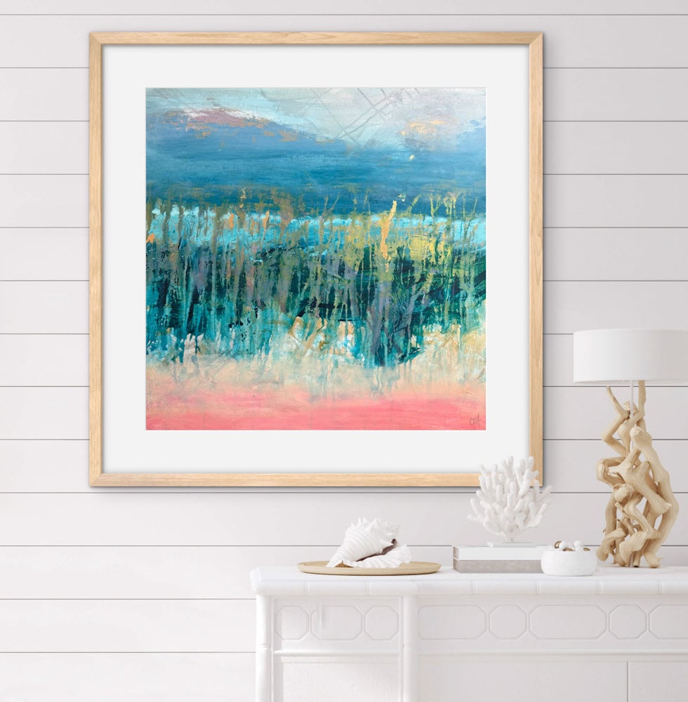 Coral pinks and soft tangerine inspired by the shoreline at dusk. Layers of turquoise, sea greens and traces of gold as the last of the sunlight filters through the waves. Also available as Limited Edition giclee prints hand embellished with 24K gold leaf.